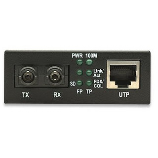 Fast Ethernet Media Converter 10/100Base-TX to 100Base-FX (ST) Multi-Mode, 2 km (1.24 mi) Color: Black •Data transfer rate: 100 Mbps •One 10/100Base-TX RJ45 port, maximum distance 100 m / 300 ft. •RJ45 port with Auto MDI/MDI-X support and auto-negotiation •One 100Base-FX multi-mode Fiber ST duplex port •Fiber distance support: up to 2 km / 1.24 mi (62.5/125 or 50/125 µm cable) •Wavelength: 1310 nm •Flow control •Status LEDs for power and Link/TX for both ports •External power adapter, 5 V DC.