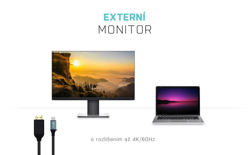 Rozšiřte svou pracovní plochu o externí HDMI monitor přes nový USB-C nebo Thunderbolt 3 konektor. Tento kabelový adaptér podporuje přenos 4K Ultra HD rozlišení až 3840 x 2160 pixelů včetně audio signálu.