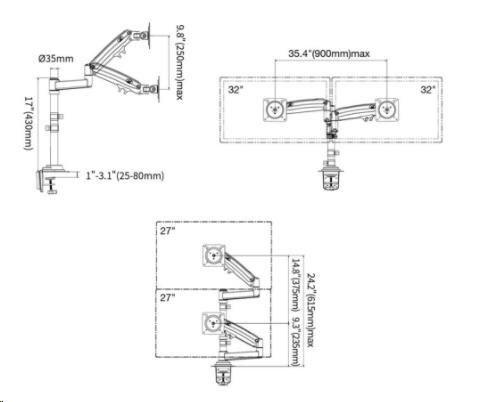 Monitorový držák na okraj stolu nebo do prostoru stolové desky, 19-32", otočný, sklopný, výsuvný, duální výškové polohování, pivot, systém pro uspořádání kabeláže, nosnost 18kg.