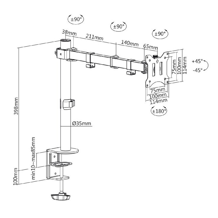 Kancelářský držák na monitory Fiber Mounts M8C83 Stolní držák na monitory 15-32", polohovatelný, stabilní, spolehlivý, VESA 75x75 a 100x100, nosnost 8kg Stolní držák na monitory do kanceláří a pracoven na monitory 15-32". Držák umožňuje snadné polohování monitoru do potřebné pozice: otáčení do stran +360° / -360°, naklápění +45° / -45°, vzdálenost monitoru od nosníku (trubky) 83-430mm, výškové polohování po celé délce nosníku (trubky) max. 300mm. Držák podporuje VESA 75x75 a 100x100. Držák můžete uchytit na okraj stolu nebo na stolovou desku (průchodka nebo vyvrtat 1 otvor 10mm). Barevné provedení černé, záruka 5 let. Stolní držák na monitory, otočný, sklopný, výsuvný a výškově polohovatelný Fiber Mounts M8C83 Technické údaje: nosnost 8kg podporuje VESA standardy 75x75 a 100x100 na monitory s úhlopříčkou 15" až 32" otáčení do stran +/- 360° naklápění +/- 45° vysouvání od nosníku 83mm až 430mm výškové polohování 300mm kvalitní pevná konstrukce úchytky na kabeláž montáž na okraj stolu nebo na stolovou desku barva černá záruka 5 let Kancelářský držák na monitor Fiber Mounts M8C83 Držák na monitor Fiber Mounts M8C83 podporuje VESA standardy: VESA 75x75 VESA 100x100 Držáky Fiber Mounts M8C83 se stali populární díky výbornému poměru kvality a příznivé ceny. Držák umožňuje snadné polohování monitoru v širokém spektru. Držáky se osvědčili v kancelářích, učebnách, ale i domácnostech..
