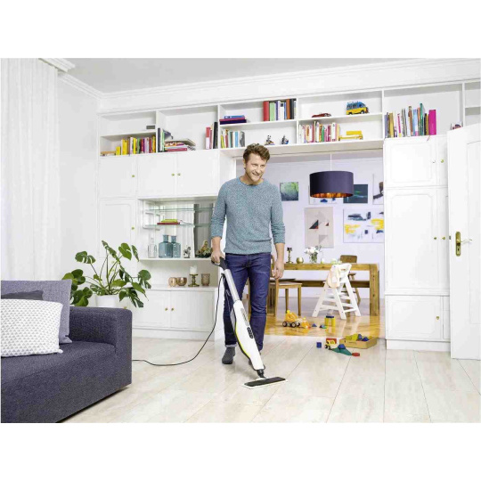 Parní mop Kärcher SC 3 Upright EasyFix s vysokou účinností zabíjí i KORONAVIRY* a BAKTERIE**. Vyznačuje se pohodlnou manipulací, prací bez přerušování a neustálou připraveností pustit se kdykoliv do práce (odnímatelná a doplnitelná nádrž). Nahřívání trvá pouhých 30 s a stav mopu vám prozradí LED ukazatel. Využít lze 3 stupně páry pro dřevo, dlažbu či koberce. Součástí je i kobercový kluzák nebo odvápňovací patrona změkčující vodu. Za jednoduchou manipulací podlahového čističe se skrývá podlahová hubice s flexibilním kloubem a chytré upínání utěrky z mikrovláken na suchý zip bez nutnosti přímého kontaktu s nečistotami. * Testy ukázaly, že při bodovém čištění v přímém kontaktu s čištěným povrchem po dobu 30 sekund při max. tlaku páry s parními čističem Kärcher lze odstranit 99,999 % obalených virů, jako je koronavirus nebo chřipka (s výjimkou viru hepatitidy B), na běžných hladkých tvrdých površích v domácnostech (testovaný zárodek: Modified-Vaccinia-Ankara Virus).** Při důkladném čištění s parním čističem Kärcher bude 99,99 % všech běžných domácích bakterií zničeno na běžných hladkých tvrdých površích v domácnostech za předpokladu, že rychlost čištění je max. 30 cm/s při max. výkonu páry, a to za přímého kontaktu s čištěným povrchem (testovaný zárodek: Enterococcus hirae)..