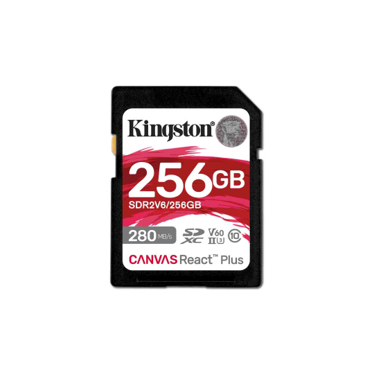 SD karta Kingston Canvas React Plus V60 poskytuje působivý výkon pro kamery UHS-II pro zachycení 4K videa. Disponuje rychlostními třídami U3 a V60 s přenosovými rychlostmi až 280 MB/s a kapacitou až 1 TB.