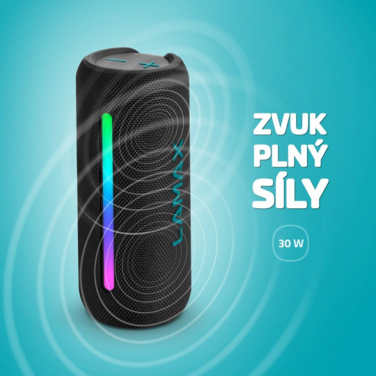 Naskoč na vlnu zábavy, s LAMAX LightNote1 to bude parádní jízda. V malém kompaktním těle přenosnýho repráku se ukrývá výkon až 30 W, který tě vydrží bavit až 20 hodin. Propoj s ním svoje zařízení přes Bluetooth 5.3 a užij si playlist, filmy nebo podcasty na maximum. Čistý a vyrovnaný zvuk ještě umocníš připojením dalšího repráku, což zařídí TWS funkce. Máš soubory na microSD nebo jiným zařízení? Pohoda, reprák podporuje řadu připojení i formátů. A když nemáš po ruce playlist, přecvakni na FM rádio a mejdan může začít. Atmošku dotvoří LED podsvícení. Ovládání tohohle mazlíka je snadný a intuitivní. Když hlásí, že mu dochází dech, energii mu doplníš přes USB-C a zase s tebou půjde, kam chceš. Klidně vyrazte ven, krytí IPX6 si poradí i s vrtochy počasí.
