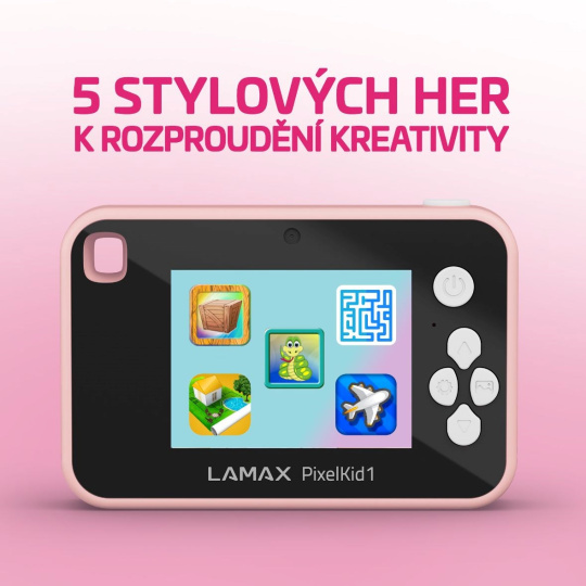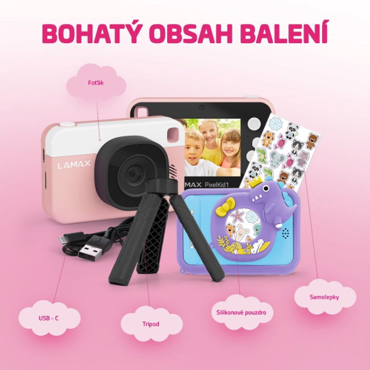 Přirozenou dětskou zvídavost a kreativitu je třeba podporovat, proto přichází LAMAX PixelKid1. Dětský fotoaparát přispěje k rozvoji talentu malých fotografů, kteří jej užijí na výletech, rodinných oslavách nebo třeba školních akcích. Kromě focení v rozlišení 8 Mpx, zvládá foťák i pořízení video záznamu ve Full HD a dětem nabízí i pět různých her pro zabavení, když čekají na záběr. Pocit profesionality dodá menším i větším fotografům přibalený tripod a možnost použití několika filtrů a efektů pro ozvláštnění fotek. Cool design v růžovém nebo modrém provedení si dítě okamžitě zamiluje, a zvláště menší ratolesti ocení parádní silikonové ochranné pouzdro s dinosaurem. Vlastní osobitý styl pak foťáku dodají nalepením samolepek, které najdou v balení. Všechny záznamy včetně autoportrétů ze selfie kamery se ukládají na microSD kartu. A ještě jednu šikovnou vlastností foťák vyniká, zvládá přehrávat MP3. Dítě tak zaujme a zabaví po všech stránkách.