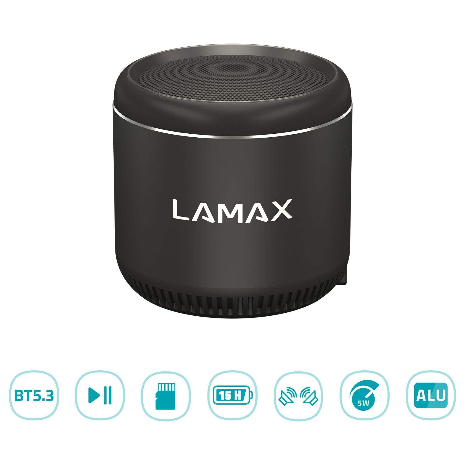 Nejmenší bezdrátový reproduktor, výkon 5 W, váha 71 g, výdrž až 15 hodin, Bluetooth 5.3, dosah 10 metrů, BeatBass®, funkce TWS pro připojení druhého reproduktoru, hliníkové tělo, přehrávání MP3 z Micro SD karty..... více