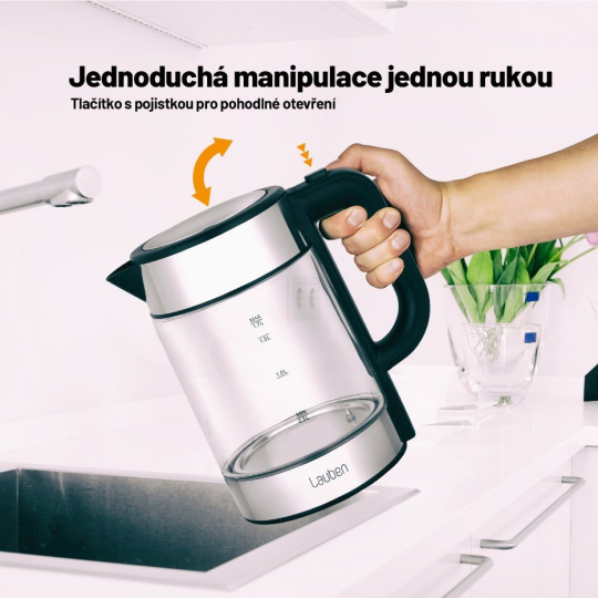 Teplotu volíte v rozmezí 60-100 °C po desetistupňových intervalech. V konvici Lauben ohřejete až 1,7 l vody naráz. Její aktuální množství vždy poznáte díky stupnici na skle. Víko konvice je opatřeno bezpečnostní pojistkou proti rozlití a otevíráte jej snadno, pomocí tlačítka umístěného na držadle.