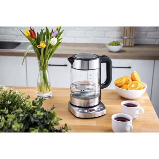 Skleněná rychlovarná konvice, 1,7 l, 2200 W, nastavitelná teplota 60 - 100°C po deseti stupních, funkce Keep Warm, velký LED displej, podsvícená tlačítka, pojistka proti přehřátí a vaření nasucho, vyjímatelný omyvatelný filtr, otočná základna, prostor pro kabel, One-Touch otvírání.... více