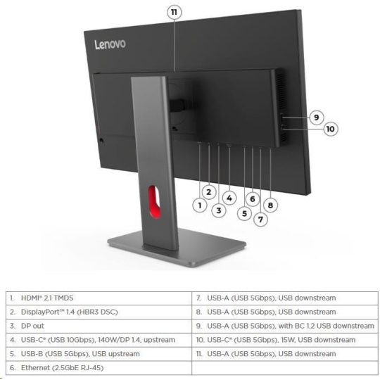 | USB Port | 1x USB-C (USB 10Gbps,DP 1.4 Alt Mode HBR3, PD3.1 140W, USB upstream), 1x USB-B (USB 5Gbps, USB upstream), 3x USB-A (USB 5Gbps, USB downstream), 1x USB-A (USB 5Gbps, with BC1.2, USB downstream), 1x USB-C (USB 5Gbps, 15WPD, USB downstream) |