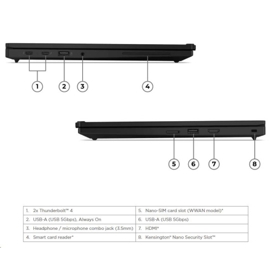 | Standartné porty | 2x USB-A (USB 5Gbps / USB 3.2 Gen 1), one Always On 2x USB-C® (Thunderbolt™ 4 / USB4® 40Gbps), with USB PD 3.1 and DisplayPort™ 2.1 1x HDMI® 2.1, up to 4K/60Hz 1x Headphone / microphone combo jack (3.5mm) Optional Ports (configured) 1x Smart Card Reader 1x Nano-SIM Card Slot  |