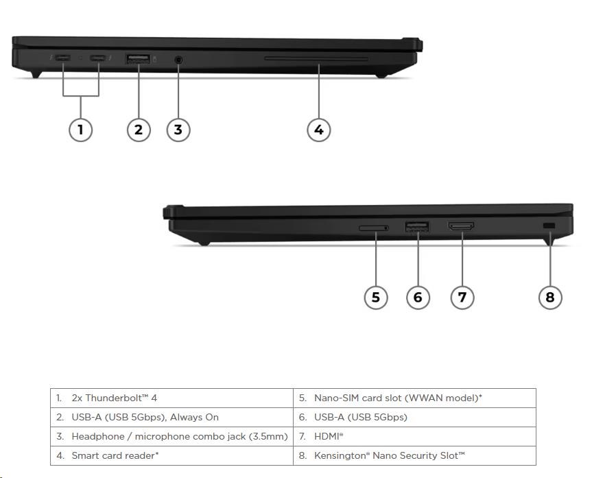 | Standartné porty | 2x USB-A (USB 5Gbps / USB 3.2 Gen 1), one Always On 2x USB-C® (Thunderbolt™ 4 / USB4® 40Gbps), with USB PD 3.1 and DisplayPort™ 2.1 1x HDMI® 2.1, up to 4K/60Hz 1x Headphone / microphone combo jack (3.5mm) Optional Ports (configured) 1x Smart Card Reader 1x Nano-SIM Card Slot  |