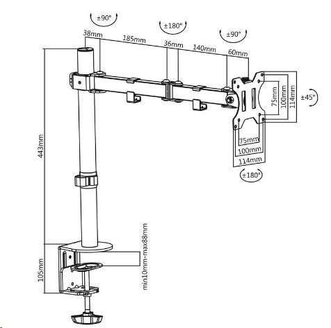 Levný kvalitní stolní držák monitoru Fiber Novelty F10 Otočný, sklopný, výškově i délkově nastavitelný držák monitoru 13-32", funkce PIVOT, 2 typy uchycení na stolovou desku, nosnost 8kg Levný, přesto kvalitní stolní držák pro uchycení LCD LED OLED monitoru s úhlopříčkou 13 až 32 palců. Po uchycení monitoru na držák oceníte zvětšený prostor na stole, monitor navíc můžete dle libosti otáčet do stran, naklápět, vysouvat a i výškově polohovat, monitor lze rotovat pro horizontální nebo vertikální otočení. Držák podporuje VESA standardy 75x75 a 100x100. Držák je možné zatížit monitorem s hmotností až 8kg. Ramena jsou osazena úchyty pro zafixování kabeláže. V balení naleznete 2 typy uchycení na stolovou desku, která může mít průměr 10mm až 88mm. Dodáváme v černé barvě, balení obsahuje potřebný instalační materiál. Levný držák na monitor 13-32 palců Fiber Novelty F10 splní požadavky i náročným zákazníkům, přitom za zlomek ceny jiných držáků na monitory. Otočný, sklopný, délkově a výškově stavitelný, funkce pivot, vedení kabeláže, 2 úchyty na stolové desky... Levný stolní držák na monitor do Vaší pracovny nebo kanceláře - plně nastavitelný, výborná kvalita - Fiber Novelty F10 Technické údaje: nosnost 8kg podpora VESA standardu 75x75 a 100x100 doporučujeme na monitory s úhlopříčkou 13 až 32" otáčení do stran +/- 360° náklon +/- 45° vysunutí monitoru až 421mm nastavení výšky, max. 420mm nastavení tuhosti chodu ramen uchycení na stolovou desku o průměru 10 až 88mm 2 typy uchycení na stolovou desku úchytky na kabeláž montážní materiál barva černá záruka 3 roky.