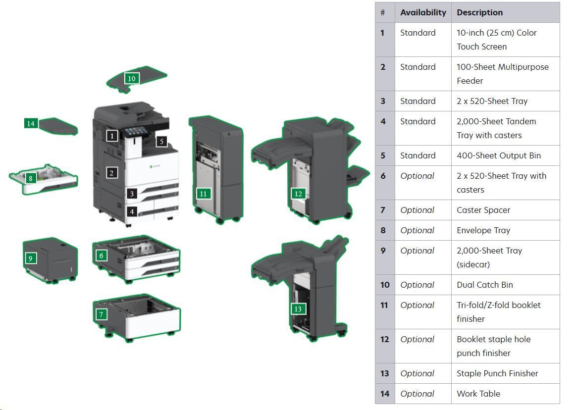 Funkce: Lexmark e-Task 10" (25 cm) barevný dotykový displej, Barevný laser, Barevné skenování, Barevné síťové skenování, Barevný tisk, Barevné faxování, Barevné kopírování, Trusted Platform Module (TPM)*, *Modul Trusted Platform Module (TPM) není v některých zemích dostupný. - Tisková náplně dodávány s produktem: Černá tonerová kazeta na 18 500* stran, 11,500*-page Color (CMY) Toner Cartridges - Duplexní (oboustranný) tisk: Integrovaný duplex - Pevný disk: Včetně inteligentního úložného disku; Magnetický pevný disk k dispozici - Přímé USB: Ano - Rychlost tisku (A4, černobíle): Až 65 str./min. 1) - Čas první stránky (černobíle): 4.7 sekund 1) - Rychlost tisku (A4, barevně): Až 65 str./min. 1) - Paměť, standardně: 4096 MB - Maximální měsíční funkční cyklus: 340 000 stránek za měsíc 2) - Doporučený měsíční objem tisku: 7,000 - 50,000 stránek 2) - Dotykový displej: Ano - Kapacita vstupu papíru, standardně: Až 3140 stránek - Záruční doba produktu: 1-Year Onsite Repair, Next Business Day.