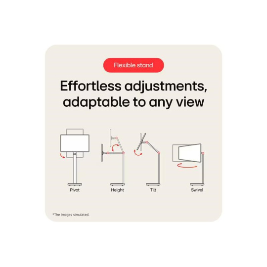 Náš chytrý monitor je vybaven flexibilním stojanem s torzním pántem, který umožňuje nastavení náklonu, otočení, výšky i režimu na výšku pro snadné přizpůsobení pozorovacího úhlu. Silná čtvercová základna zajišťuje stabilitu a elegantní šedo-bílé provedení ladí s každým interiérem – doma i na pracovišti.