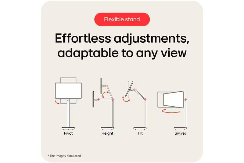 Náš chytrý monitor je vybaven flexibilním stojanem s torzním pántem, který umožňuje nastavení náklonu, otočení, výšky i režimu na výšku pro snadné přizpůsobení pozorovacího úhlu. Silná čtvercová základna zajišťuje stabilitu a elegantní šedo-bílé provedení ladí s každým interiérem – doma i na pracovišti.