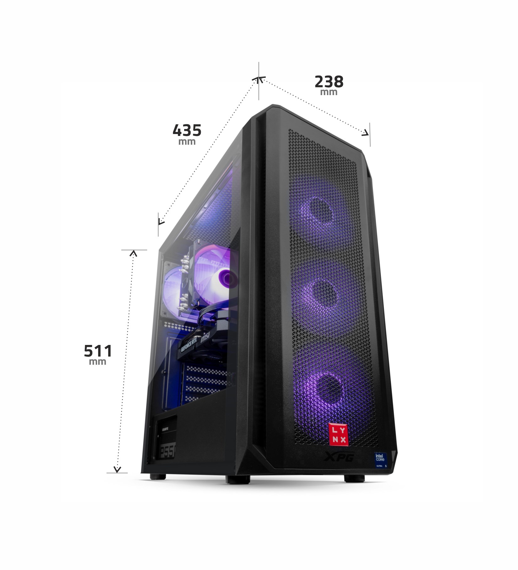 Základem sestavy je deska s čipovou sadou B650 osazená 6 jádrovým procesorem Ryzen 5 8400F, který disponuje technologií HyperThreading pro plynulejší multitasking, pracující na frekvenci 4.2 GHz, nebo až 4.7 GHz s technologií turbo. Paměti RAM značky Kingston jsou pro sestavy LYNX standardem, v této sestavě se jedná o paměti s kapacitou 16GB DDR5 (2x8GB). Plynulý obrazový výstup je zajištěný grafickou kartou NVIDIA GeForce RTX 5060, která disponuje 8GB paměti GDDR7. V této sestavě nebrzdí ani uložiště je zde SSD disk 1 TB M.2 PCIe NVMe pro veškerá potřebná data a software. Dostatečné napájení zajištuje 550W zdroj. Sestava je dodávaná včetně nového operačního systému Windows 11 Home.