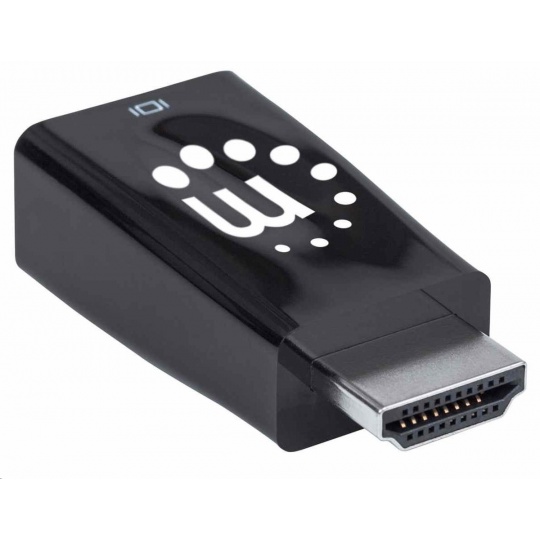 The Manhattan HDMI to VGA Micro Converter establishes a fast, simple and convenient link between a newer HDMI-equipped desktop, notebook computer or other media source and an existing VGA monitor, projector or other display device. The Manhattan HDMI to VGA Micro Converter is easy and quick to install and requires no complicated configuration or setup. This converter helps extend the service life of legacy VGA display equipment so you can get the most out of your investment and fully realize its value. The Manhattan HDMI to VGA Micro Converter offers a low-power, cost-effective and reliable solution so users can transition to HDMI bandwidths, resolutions, Deep Color and more without the expense of upgrading to newer and costly monitors and projectors. Its integrated, all-in-one design helps achieve a compact, integrated solution that eliminates unnecessary cables, tangles and clutter to keep installations and workspaces neat and orderly. Its 3.5 mm stereo port allows the converter to transmit audio to an external audio device, and its Micro-USB port allows for additional power if required.