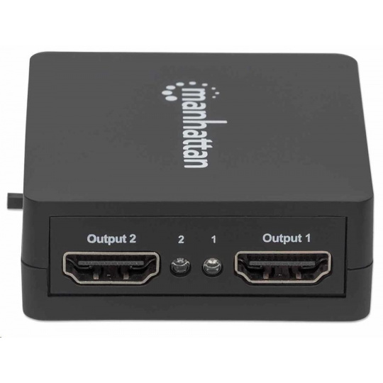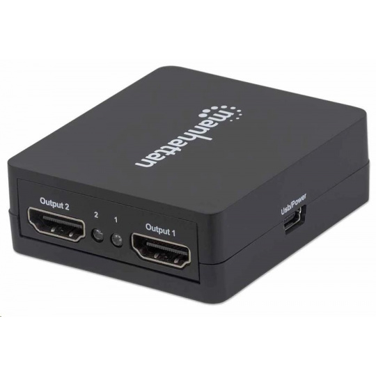 Easily distribute a single HDMI signal to multiple displays.The Manhattan 1080p 2-Port HDMI Splitter sends HDMI signals from a single Blu-ray player, satellite receiver, digital recorder, set-top box, game console or other HDMI source to two HDMI displays. Flexible Solution for Many A/V ApplicationsIdeal for trade shows, classrooms, video conferencing, presentations and retail applications, the Manhattan 1080p 2-Port HDMI Splitter features a built-in booster for added signal strength. It’s also a good choice for splitting and distributing a synchronous signal to multiple HDMI displays when source equipment is remotely stored in a secured room or cabinet. Users can cascade multiple units up to three levels and output HDMI video/audio to additional displays in widely distributed applications.Quality Construction and Easy InstallationFull compliance with HDMI, HDCP 1.0, 1.1 and 1.2 as well as DVI 1.0 ensures that the Manhattan 1080p 2-Port HDMI Splitter can provide long service and reliable performance. Quickly connect HDMI cables (not included) and the USB power cable, and this affordable HDMI solution is complete — no complicated settings or software or hardware configurations necessary.