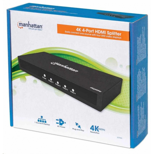 Manhattan HDMI rozdělovač, 4K 4-Port HDMI Splitter, 4K@60Hz, AC Powered, černá