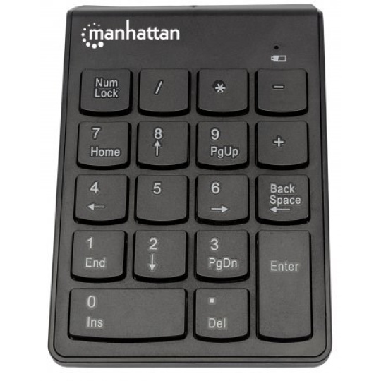 Manhattan Numeric Wireless Keypad enhances any notebook computing experience, especially when inputting important numeric data. The full-size 18-key layout and membrane (full-travel) key-switch technology reduce typing noise, improve response and provide low-profile keystrokes for fast and accurate data entry. A handy backspace key allows swift corrections. The asynchronous number-lock function allows users to simultaneously input letters from the computer's keyboard and numeric data from the keypad. Its USB Wireless Receiver connection, plug-and-play installation and ultra slim, lightweight construction make it easy to pack and travel.