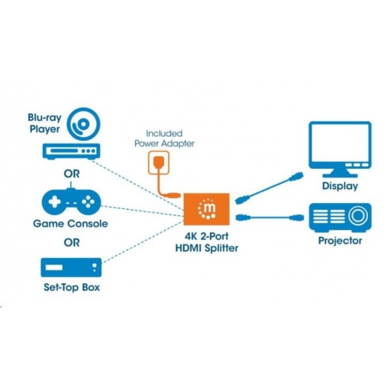 Full compliance with HDMI, HDCP 1.4 and DVI 1.0 ensures that the Manhattan HDMI Splitter can provide long service and reliable performance. Quickly connect HDMI cables (not included) and the AC power adapter, and this affordable UHD solution is complete — no software/hardware configuration or complicated settings required.
