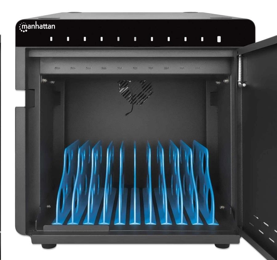 Keep your devices organized in the 10 bays with 264 (D) x 22 (W) x 235 (H) mm / 10.39 x 0.87 x 9.25 in. each. Use the cable management built into the dividers to structure your charging cables (available from Manhattan). As this Charging Cabinet features USB-C ports instead of AC outlets, you do not need additional wall chargers. The AC input on the back is a C20 connector that lets you replace the included power cable with other cables based on your region.