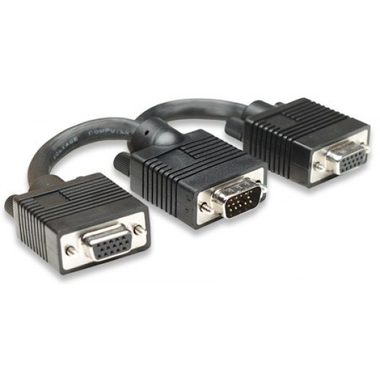 Manhattan SVGA Y Cables easily split a single signal to connect a desktop or notebook computer with two monitors. Ideal for use with any HD15-equipped display, computer or device, Manhattan SVGA Cables are engineered and constructed of quality materials to deliver dependable transmissions in video applications. Full foil and braided shielding, molded boots with strain relief and mini-coax (RGB) and paired video wire construction help provide maximum conductivity and clear, crisp images with reduced EMI interference and distortion over extended distances.