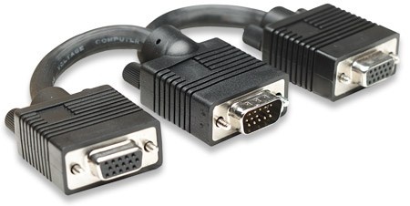 Manhattan SVGA Y Cables easily split a single signal to connect a desktop or notebook computer with two monitors. Ideal for use with any HD15-equipped display, computer or device, Manhattan SVGA Cables are engineered and constructed of quality materials to deliver dependable transmissions in video applications. Full foil and braided shielding, molded boots with strain relief and mini-coax (RGB) and paired video wire construction help provide maximum conductivity and clear, crisp images with reduced EMI interference and distortion over extended distances.