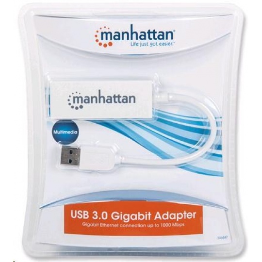 The Manhattan USB 3.0 Gigabit Adapter is a compact, high-performance network adapter that allows you to upgrade your desktop or notebook computer to operate at 10/100/1000 Mbps speeds on the LAN. Because it attaches to one of your computer’s USB connectors, there is no need to open up your PC — and the user-friendly setup software makes installation quick and easy. Faster Throughput through SuperSpeed USB 3.0 Other USB Gigabit adapters that only support USB 2.0 can not even come close to the performance levels of this latest generation high-performance network adapter, since they are limited by the USB 2.0 bus design to a theoretical maximum of 480 Mbps. The Manhattan USB 3.0 Gigabit Adapter adapter knows no such limitations and delivers true gigabit performance without compromises. Auto-Negotiation The USB 3.0 Gigabit Adapter will automatically detect the network speed that the LAN switch port is set to and run at the same speed. The adapter supports 10Base-T Ethernet, 100Base-TX and 1000Base-T Gigabit Ethernet. Full Duplex When running in full duplex mode, the USB 3.0 Gigabit Adapter connects at the following link speeds: 20 Mbps (10Base-T Ethernet), 200 Mbps (100Base-TX Fast Ethernet) and 2 Gbps (1000Base-T Gigabit Ethernet). Portable Design The USB 3.0 Gigabit Adapter is compact and can be easily used from one computer to another or transferred in your notebook case as you travel. It doesn’t take up a lot of space, and doesn't add clutter to your workspace. - Upgrade your notebook or desktop computer to full gigabit speeds - Quick and reliable sharing of large files over your network - Supports SuperSpeed USB 3.0 interfaces and is downward compatible to High-Speed USB 2.0 and USB 1.1 - Hot-swappable (no need to power down) - Full duplex with auto-speed detection - Supports the most popular operating systems: Windows XP, Vista and Windows 7/8 - Compatible to Mac OS X - Low power consumption via a USB bus - Three-Year Warranty Standards - USB Specification version 3.0 - USB Specification version 2.0 - USB Specification version 1.1 - USB Specification version 1.0 - IEEE 802.3 (10Base-T Ethernet) - IEEE 802.3u (100Base-TX Fast Ethernet) General - USB type-A connector - RJ45 connector - Certifications: FCC Class B, CE, RoHS LEDs - Link - 10/100/1000 Mbps Power - USB bus-powered - Operating mode: 420 mA - Suspend mode : 38 mA Environmental - Dimensions: 97 (L) x 23 (W) x 15 (H) mm (3.8 x 0.9 x 0.6 in.) - Weight: 145 g (5.11 oz.) - Operating temperature: 0 – 40°C (32 – 104°F) - Storage temperature: -10 – 80°C (14 – 176°F) - Storage humidity: 5 – 85%, non-condensing System Requirements - Desktop or laptop system with USB 1.1, USB 2.0 or USB 3.0 port - Windows XP/Vista/Windows 7/8, Mac OS 10.6 and later Package Contents - SuperSpeed USB 3.0 to Gigabit Ethernet Adapter - Setup CD - Instructions.