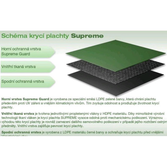 Pro období, kdy není bazén používán, doporučujeme zakrytí krycí plachtou. Zamezíte tím vnikání mechanických nečistot např. listí, hmyzu nebo pylu do vašeho bazénu. Díky použití ochranné vrstvy Supreme Guard je krycí plachta Supreme pevnější a lépe odolává povětrnostním vlivům – nejedná se ale o zimní plachtu a používání při teplotách pod bodem mrazu životnost krycí plachty snižuje. Barva krycí plachty je zelenočerná nebo modročerná (barvu při objednávce nelze zvolit). K bazénu ji snadno a rychle uchytíte pomocí lanka a napínáku s ráčnou. Ocelové lanko potažené plastovou ochrannou vrstvou i napínák s ráčnou jsou součástí balení.
