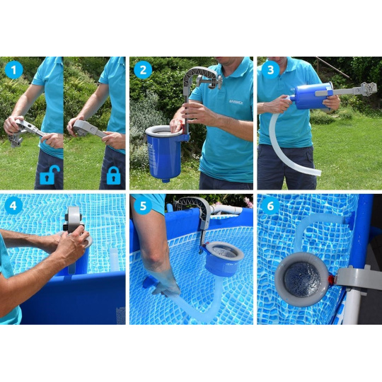 Marimex skimmer závěsný univerzální je sběrač hladinových nečistot pro všechny nadzemní bazény, vhodný pro bazény s nafukovacím prstencem i kovovou konstrukcí, součástí košík pro vkládání chlorových tablet a 5/4 hadice k propojení skimmeru a průchodu stěnou.