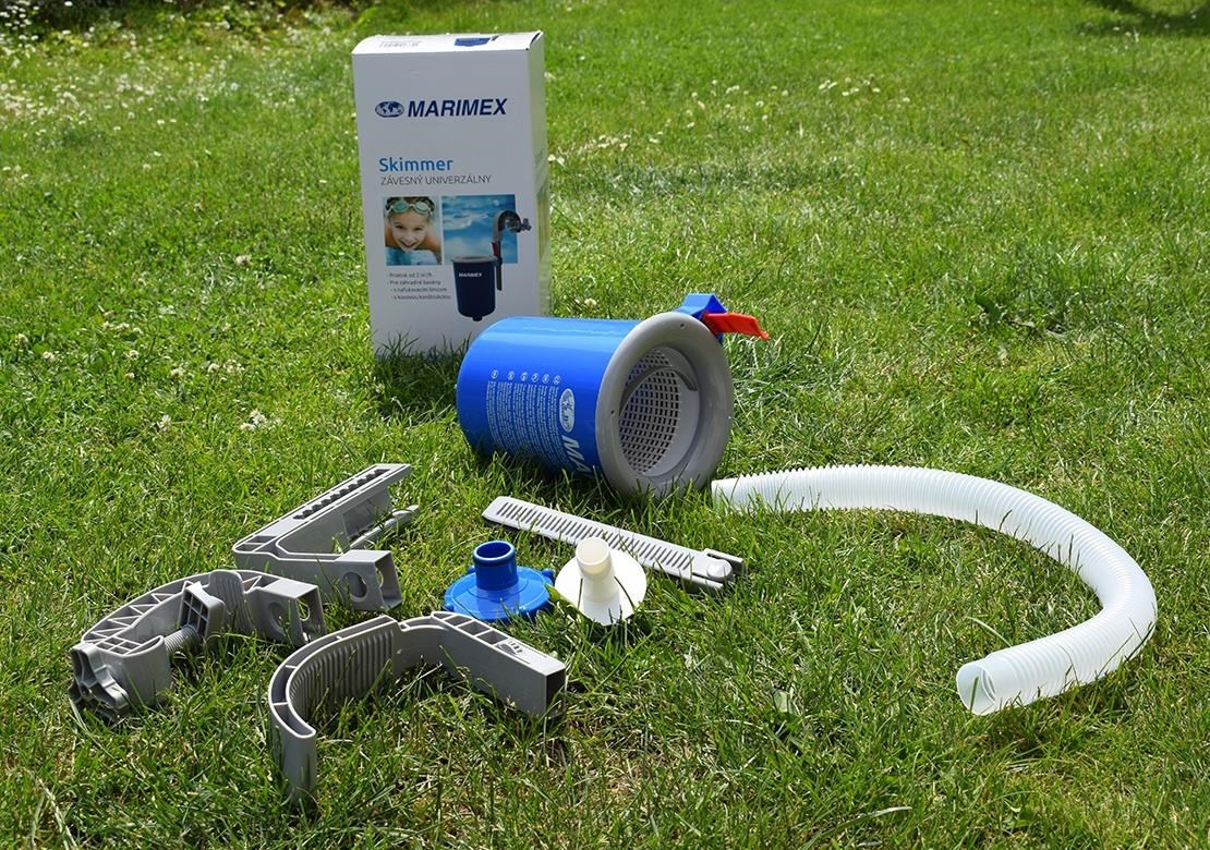 Marimex skimmer závěsný univerzální je sběrač hladinových nečistot pro všechny nadzemní bazény, vhodný pro bazény s nafukovacím prstencem i kovovou konstrukcí, součástí košík pro vkládání chlorových tablet a 5/4 hadice k propojení skimmeru a průchodu stěnou.