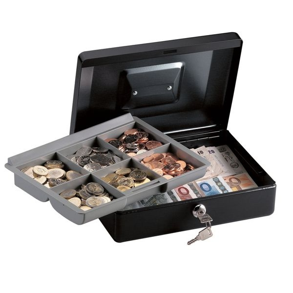 Pokladní uzamykatelný box CB-10ML slouží pro uložení hotovosti, je z pevné ocelové konstrukce. Vyjímatelný tác se 6-ti přihrádkami pro mince a 2ks klíčů jsou součástí balení. Navíc obsahuje praktické držadlo..