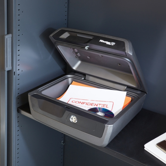 Uzamykatelný bezpečnostní kufr odolný ohni a vodě LCFW30100 z pevné ocelové konstrukce je vhodný pro uchování digitálních médií a písemností ve formátu max. A4. Objem činí 10,2l. 2ks klíčů a praktické držadlo jsou součástí balení..