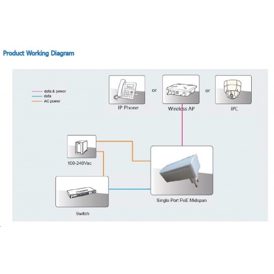 axLink PI15S je velmi kvalitní Gigabitový POE injektor s jedním výstupním POE portem pro napájení zařízení s podporou 802.3af a maximální spotřebou až 15,4W. PoE injektor se připojuje přímo do zásvuky. Napájení je vedeno po vodičích 4,5 (+) a 7,8 (-). Napájecí injektor je vhodný zejména pro napájení IP kamer, VoIP telefonů atp..