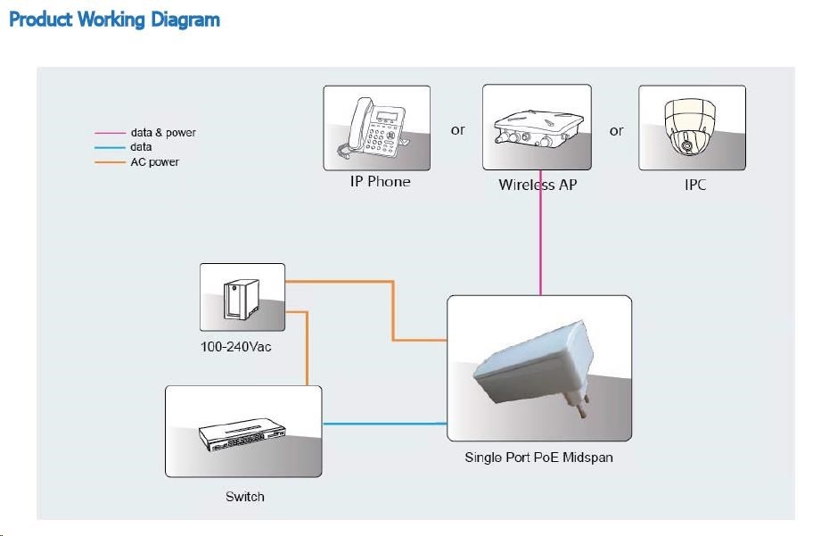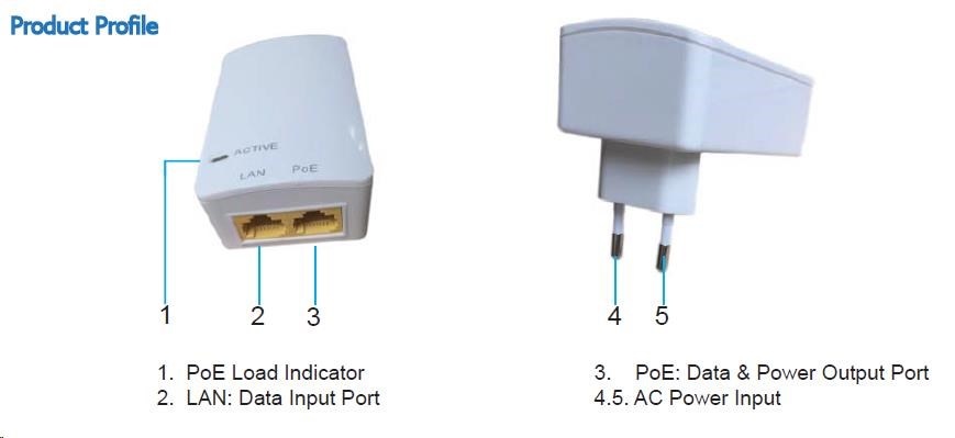 axLink PI15S je velmi kvalitní Gigabitový POE injektor s jedním výstupním POE portem pro napájení zařízení s podporou 802.3af a maximální spotřebou až 15,4W. PoE injektor se připojuje přímo do zásvuky. Napájení je vedeno po vodičích 4,5 (+) a 7,8 (-). Napájecí injektor je vhodný zejména pro napájení IP kamer, VoIP telefonů atp..