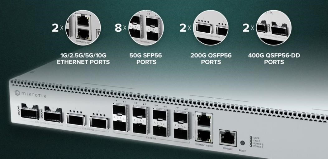 MikroTik CRS812-8DS-2DQ-2DDQ-RM 2x 400G QSFP-DD, 2x 200G QSFP56, 8x 50G SFP56, 2x 10GE Cloud Router Switch