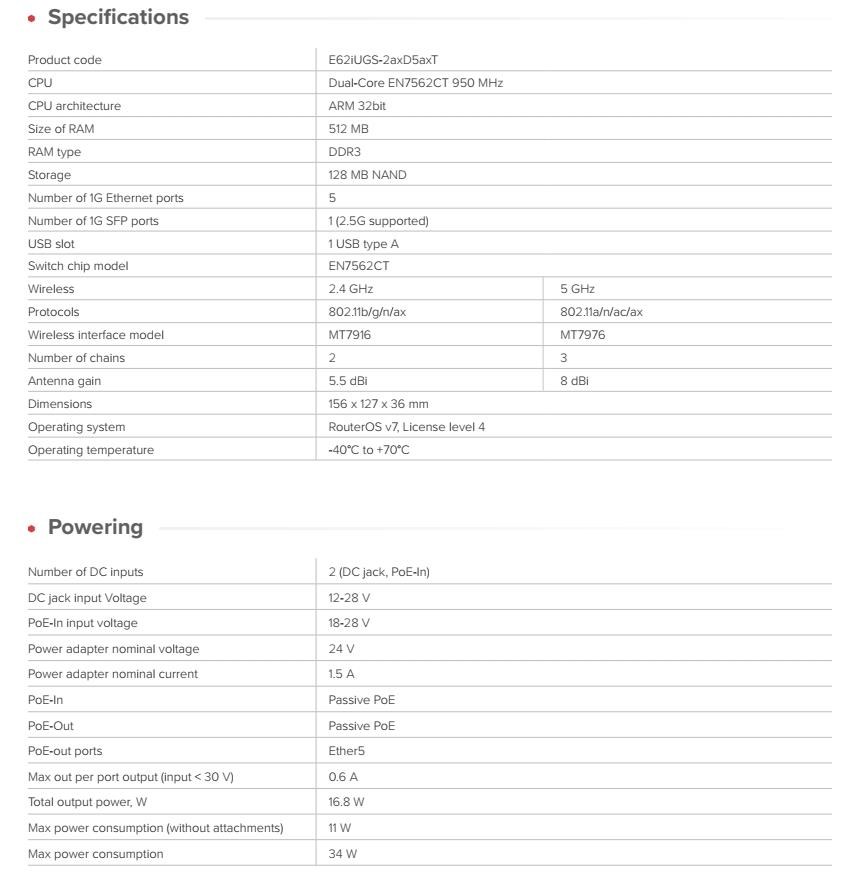 hAP ax S – nejvýhodnějším přístupový bod Mikrotiku s Wi-Fi 6. Levnější než většina sériově vyráběných wifirouterů střední třídy a přitom nabízí mnohem větší flexibilitu.  Pod elegantním vnějším pláštěm se skrývá dvoujádrový procesor ARM, dvoupásmové Wi-Fi 6, USB, pět gigabitových ethernetových portů a 2,5 gigabitová SFP šachta. Můžete se připojit přímo k optickému kabelu nebo propojit vysokorychlostní NAS pro bleskurychlý místní přístup.  Triple-chain 5GHz: klíč ke stabilnímu Wi-Fi v gigabitové třídě Nový hAP ax S je vybaven triple-chain 5GHz rádiem, které dosahuje reálné propustnosti kolem 800–900 Mbit/s. To znamená plynulé streamování, rychlejší stahování a stabilní výkon na více zařízeních.  Je také ideální jako specializovaný přístupový bod Wi-Fi 6 VR pro streamování pro PC VR headsety, který nabízí vyšší rozlišení a nižší latenci bez kabelů. Na rozdíl od jednoúčelových „herních“ přístupových bodů vám hAP ax S nabízí plný výkon, flexibilitu a funkční budoucnost v stále zdokonalovaném RouterOS v7.  Flexibilní napájení AP skýtá dvě možnosti napájení – přes DC konektor nebo PoE-in – dále integrován pasivní port PoE-out. PoE-out port využijete pro napájení dalšího zařízení MikroTik, jako je například další AP nebo kompaktní stolní switch.  Vaše síť, Vaše pravidla Navzdory nízké ceně běží hAP ax S na plné verzi RouterOS v7, nejflexibilnějším síťovém softwaru na trhu. V době rostoucích výzev v oblasti zabezpečení dat a ochrany soukromí vám RouterOS poskytuje úplnou kontrolu – bez předplatného, bez upsellů, bez uzamčených funkcí. Ať už konfigurujete svou první Wi-Fi síť prostřednictvím aplikace MikroTik nebo budujete složité topologie, RouterOS v7 roste s vámi.  VLAN, firewally, VPN tunely, tvarování provozu, skriptování, automatizace SMS – možnosti jsou neomezené. Například: můžete snadno izolovat zařízení IoT do samostatných podsítí, abyste ochránili svou domácí síť před nechtěným přístupem přes smart spotřebiče.  Dodáváno s napájecím adaptérem 24V 1.5A v produktovém balení.  Technické specifikace: Product code: E62iUGS-2axD5axT CPU: Dual-Core EN7562CT 950 MHz CPU architecture: ARM 32bit Size of RAM: 512 MB RAM type: DDR3 Storage: 128 MB NAND Number of 1G Ethernet ports: 5 Number of 1G SFP ports: 1 (2.5G supported) USB slot: 1 USB type A Switch chip model: EN7562CT Wireless: 2.4 GHz, 5 GHz Protocols: 802.11b/g/n/ax, 802.11a/n/ac/ax Wireless interface model: MT7916 MT7976 Number of chains: 2,4GHz - 2, 5GHz - 3 Antenna gain: 2,4GHz - 5.5dBi, 5GHz - 8dBi Dimensions: 156 x 127 x 36 mm Operating system: RouterOS v7, License level 4 Operating temperature: -40°C to +70°C  Napájení Number of DC inputs: 2 (DC jack, PoE-In) DC jack input Voltage: 12-28 V PoE-In input voltage: 18-28 V Power adapter nominal voltage: 24 V Power adapter nominal current: 1.5 A PoE-In: Passive PoE PoE-Out: Passive PoE PoE-out ports: Ether5 Max out per port output (input < 30 V): 0.6 A Total output power: 16.8 W Max power consumption (without attachments): 11 W Max power consumption: 34 W  Upozornění: Výrobce Mikrotik neposkytuje záruku na zařízení poškozená přepětím. Zařízení je třeba adekvátně chránit proti indukovanému elektrostatickému přepětí či přepěťovým špičkám na silovém vedení. Pro venkovní instalace používat výhradně stíněnou kabeláž (FTP/SFTP) a jednotky korektně uzemnit (prostřednictvím integrovaného zemnícího členu či použitím ethernetové přepěťové ochrany).  Zařízení vždy provozujte s poslední výrobcem publikovanou verzí (výrobcem označenou "Stable") operačního systému RouterOS. Taková verze garantuje nejoptimálnější funčknost, obsahuje opravené chyby z verzí předchozích a výkonová vylepšení..