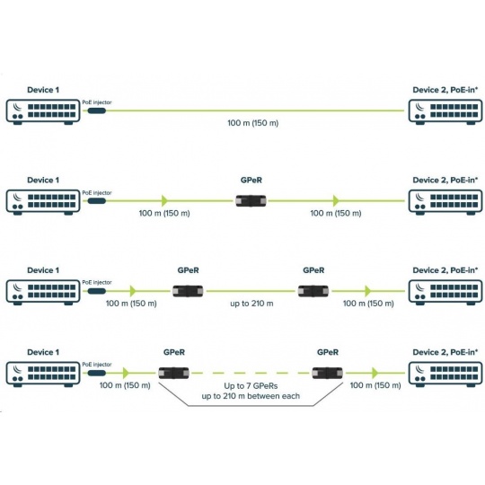 Gigabitový pasivní ethernetový repeater GPeR umožňuje prodloužit celkovou délku kabelu mezi začátkem a koncem až na vzdálenost 1500m! (při použití 7 kusů GPeR) Vhodné pro výškové budovy, vícebytové budovy, s mnoha podlažími a sekcemi, kde by mohly být velmi dlouhé kabely Ethernet.