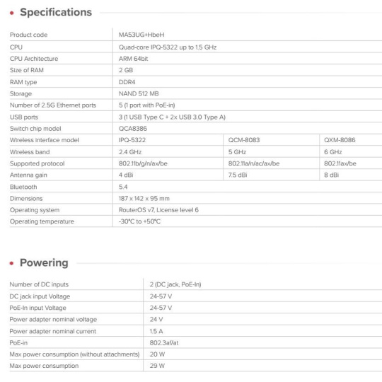 HAP be3 Media poskytuje skutečný výkon Wi-Fi 7 v pásmech 2,4, 5 a 6 GHz. Očekávejte vyšší propustnost, nižší latenci, vylepšené zabezpečení a lepší spektrální účinnost. Široké pásmo 6GHz nabízí čistší spektrum, což pomáhá snížit přetížení v rušných prostředích. Ideální řešení pro provoz s více zařízeními - domácí laboratoř, pracovní stanice, VR headsety, zálohy NAS, synchronizaci v cloudu nebo streamování médií ve vysokém rozlišení. S HAP be3 Media vše může běžet současně, aniž by se zařízení navzájem přetahovala o vysílací čas. Více pásem znamená větší kapacitu, plynulejší výkon a bezdrátové připojení, které konečně drží krok s moderními pracovními zatíženími. 2,5 Gigabit Ethernet na všech portech Ultrarychlé připojení k internetu, NAS servery, pracovní stanice – nyní poběží vše a bez limitů. Moderní domácí mediální centrum Díky USB-C, dvěma portům USB-A a slotu pro karty microSD se hAP be3 Media stane srdcem vašeho lokálního úložiště médií. Použijte flash úložiště pro zálohy, fotografie, záznamy z domácího kamerového systému nebo soukromý rodinný cloud. Samostatně hostované správce hesel, dokumenty a služby – tak to bude v roce 2026, pokud vám záleží na soukromí a bezpečnosti. Ukládejte data automatizace a pracovní zatížení kontejnerů, aniž byste se spoléhali na externí servery. Vše zůstává rychlé, lokální a plně pod vaší kontrolou. Díky aplikaci MikroTik BackToHome a vylepšené funkci sdílení souborů v WinBoxu můžete sdílet velké soubory, aniž byste se museli obávat vypršení platnosti odkazů, zpoždění nebo narušení soukromí. Integrace chytré domácnosti nikdy nebyla snazší Díky Wi-Fi 7, Bluetooth 5.4 a RouterOS v7 poskytuje hAP be3 Media pevný základ pro moderní chytré domácnosti. Vestavěné rádio Thread a plná podpora kontejnerů umožňují uživatelům nasadit řešení domácí automatizace Matter-over-Thread, která zůstávají lokální, soukromá a plně přizpůsobitelná. Čtyřjádrový výkon pro kreativní pracovní postupy Díky modernímu čtyřjádrovému procesoru s frekvencí 1,1 GHz a efektivní architektuře ARM64 je hAP be3 Media připraven na mnohem více než jen tradiční síťové připojení. Kontejnery, místní řídicí panely, skriptování, složitá pravidla brány firewall, šifrování, více VPN, BGP a pokročilé směrování – to vše běží hladce na jediném kompaktním zařízení. Jedná se o výkon, na který se můžete dnes spolehnout, a kapacitu, která bude i v příštích letech předstihovat vaše každodenní potřeby. Jako vždy je vám k dispozici kompletní sada funkcí hAP be3 Media bez jakýchkoli předplatných nebo platebních bariér. Kontejnery, to je oč tu běží ... Do WinBoxu je nově přidána jednoduchá stránka pro nastavení kontejnerů jedním kliknutím, kde můžete povolit požadované kontejnerové aplikace. Kontejnery otevírají dveře k celé řadě nových možností - • vizualizace topologie sítě • hostování "lightweight websites" (odlehčených webových stránek) • po provozování vlastních dashboardů, bezpečnostních nástrojů • provoz experimentálních lokálních AI asistentů Technické specifikace: Product code: MA53UG+HbeH CPU: Quad-core IPQ-5322 up to 1.5 GHz CPU Architecture: ARM 64bit Size of RAM: 2 GB RAM type: DDR4 Storage: NAND 512 MB Number of 2.5G Ethernet ports: 5 (1 port with PoE-in) USB ports: 3 (1 USB Type C + 2x USB 3.0 Type A) Switch chip model: QCA8386 Wireless interface model: IPQ-5322 QCM-8083 QXM-8086 Wireless bands: 2.4 GHz / 5 GHz / 6 GHz Supported protocols: 802.11b/g/n/ax/be / 802.11a/n/ac/ax/be / 802.11ax/be Antenna gain: 2,4GHz: 4 dBi; 5GHz: 7.5 dBi; 6GHz: 8 dBi Bluetooth: 5.4 Dimensions: 187 x 142 x 95 mm Operating system: RouterOS v7, License level 6 Operating temperature: -30°C / +50°C Napájení Number of DC inputs: 2 (DC jack, PoE-In) DC jack input Voltage: 24-57 V PoE-In input Voltage: 24-57 V Power adapter nominal voltage: 24 V Power adapter nominal current: 1.5 A PoE-in: 802.3af/at Max power consumption (without attachments): 20 W Max power consumption: 29 W Upozornění: Výrobce Mikrotik neposkytuje záruku na zařízení poškozená přepětím. Zařízení je třeba adekvátně chránit proti indukovanému elektrostatickému přepětí či přepěťovým špičkám na silovém vedení. Pro venkovní instalace používat výhradně stíněnou kabeláž (FTP/SFTP) a jednotky korektně uzemnit (prostřednictvím integrovaného zemnícího členu či použitím ethernetové přepěťové ochrany). Zařízení vždy provozujte s poslední výrobcem publikovanou verzí (výrobcem označenou "Stable") operačního systému RouterOS. Taková verze garantuje nejoptimálnější funčknost, obsahuje opravené chyby z verzí předchozích a výkonová vylepšení..