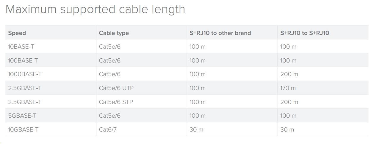 S+RJ10 je unikátní SFP+ modul, který dokáže komunikovat rychlostí 10Mbps až 10Gbps po ethernetovém kabelu. Zajímavou vlastností je schopnost 1Gbps linku až na vzdálenost 200m při instalaci mezi 2 stejné S+RJ10 moduly.