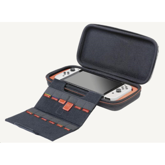 V tomto luxusním přepravním pouzdru od společnosti Nacon můžete bezpečně a pohodlně přenášet nejenom novou herní konzoli Nintendo Switch 2, ale také herní konzoli Nintendo Switch nebo Switch – OLED Model. Ústředním prvkem tohoto pouzdra je nastavitelný stojánek, který při hraní umožňuje pohodlněji sledovat dění na obrazovce, zatímco při přepravě chrání obrazovku i analogové páčky konzole před poškozením. Na jeho vnitřní straně se navíc nachází dvanáct kapsiček pro uložení karet s vašimi oblíbenými hrami. Součástí balení jsou pak také dvě menší plastová pouzdra pro microSD karty.