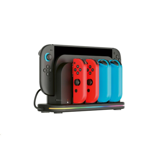 Tato nabíjecí dokovací stanice od společnosti Nacon přijde vhod všem majitelům nové herní konzole Nintendo Switch 2 i původní herní konzole Nintendo Switch, kteří často potřebují nabíjet větší počet ovladačů Joy-Con. Stanice umožňuje nabíjet současně až čtyři ovladače, jakož i samotnou konzoli, jejímuž přehřátí zabraňuje zabudovaný chladicí větráček. O stavu nabíjení každého z ovladačů informuje příslušný LED ukazatel, zatímco RGB proužek s výběrem z devíti různých efektů dodává stanici stylový, moderní vzhled. Protože napájecí USB-C kabel není součástí balení, slouží k připojení stanice do elektrické sítě originální napájecí příslušenství dodávané s konzolí.
