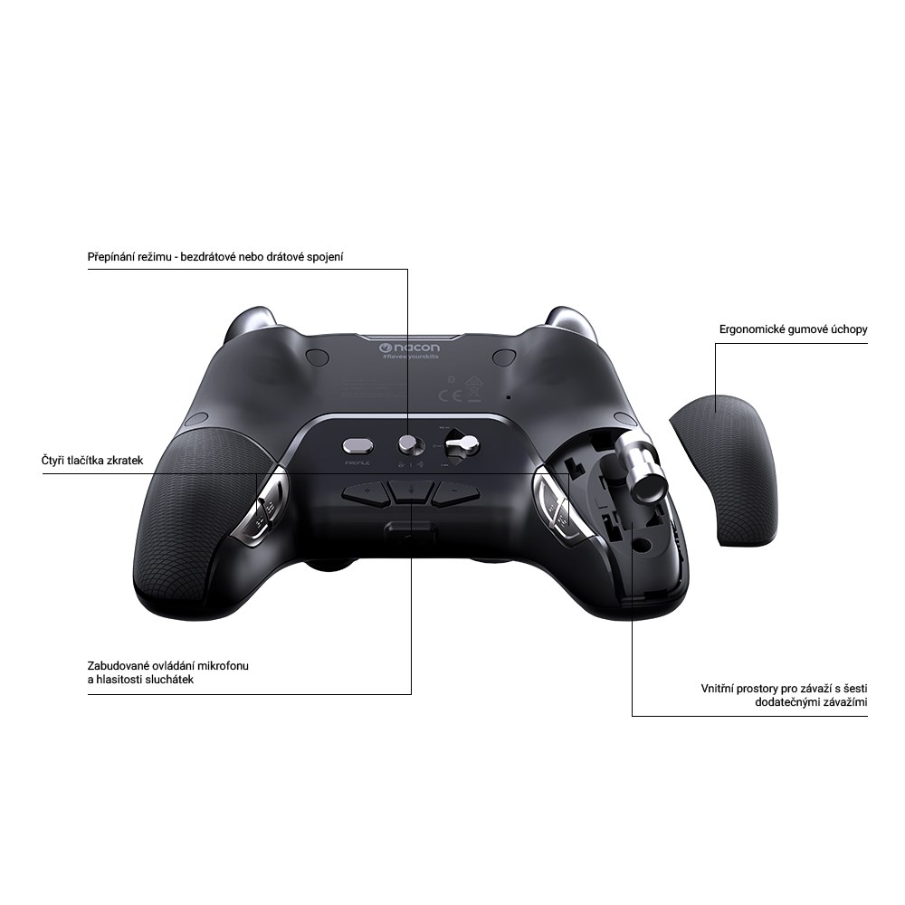 Herní ovladač Nacon Revolution Unlimited Pro Controller přináší rovněž nový dotykový panel se zakřiveným okrajem, přesnější směrový ovladač s lepší odezvou, ideálně umístěná zadní tlačítka a rozměrnější spouště s novým povrchem zaručující nejen prvotřídní odezvu, ale i vyšší pohodlí během hraní, a v neposlední řadě také texturované úchopy vyrobené technologií dvojitého vstřikování s prodlouženou životností, příjemnější na dotyk.