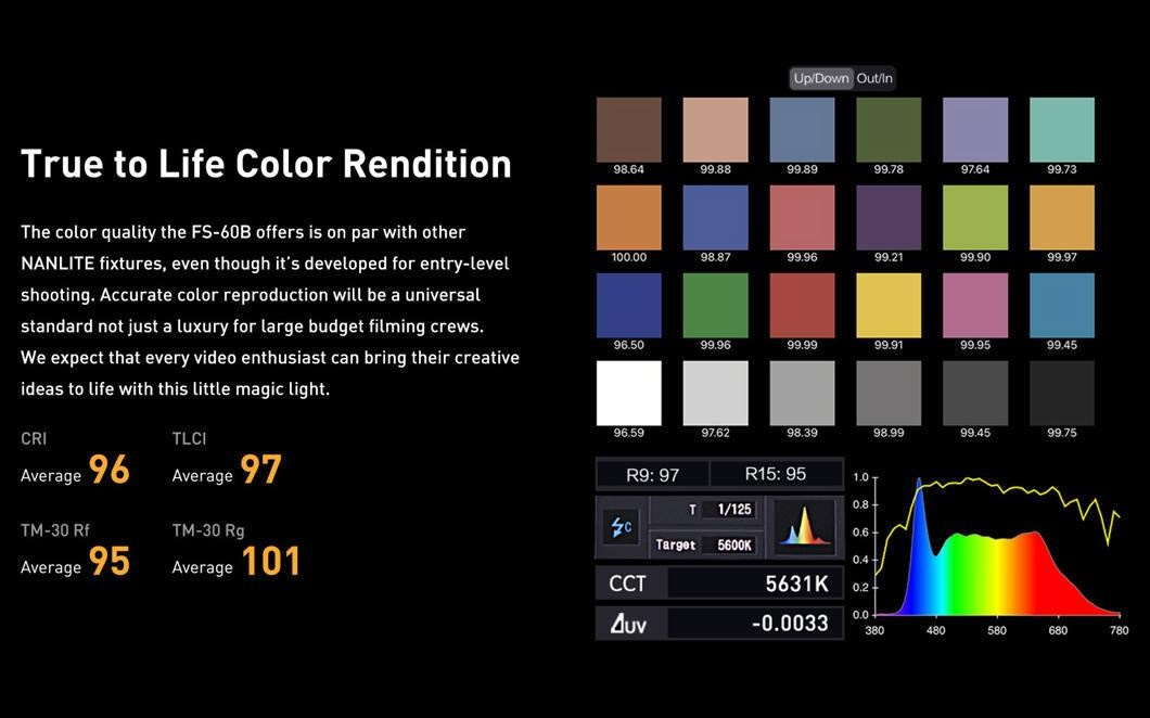 Světlo FS-60B se používá jednoduše pomocí dvou vestavěných knoflíků pro stmívání od 0 do 100 % a regulaci teploty barev. Můžete nastavit chladnější tóny bílé až teplejší tóny a cokoli mezi tím, a najít tak správnou míru osvětlení pro vaši konkrétní scénu. Světlo má také jedno tlačítko a 1,3" OLED displej pro intuitivní nastavování. Kromě snadného ovládání obsahuje model FS-60B vestavěný ventilátor, který neruší zvukové nahrávky, a v případě, že je třeba absolutní ticho, jej lze vypnout.