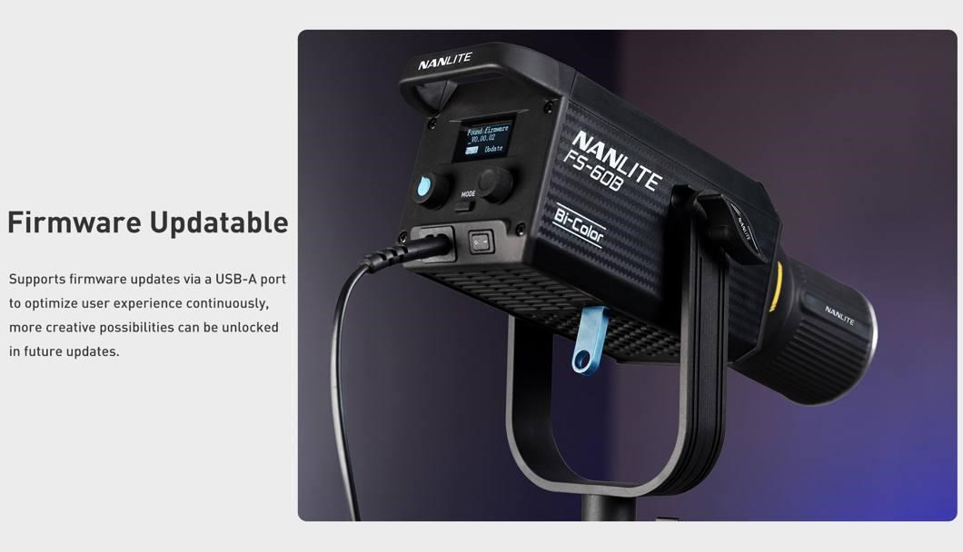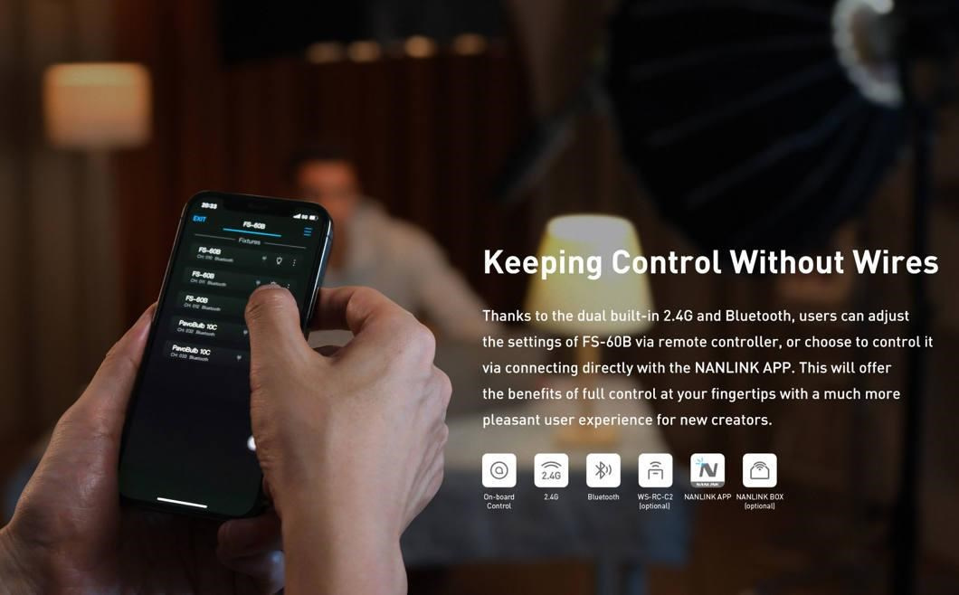 Model FS-60B je vybaven 1,3" OLED displejem pro přímé, přesné a snadné ovládání. Lze jej ale také ovládat vzdáleně prostřednictvím Bluetooth a aplikace NANLINK, která je zdarma a je určena pro systémy iOS i Android, pomocí 2.4GHz připojení s využitím samostatně dostupného manuálního dálkového ovladače WS-RC-C2 nebo boxu vysílače WS-TB-1.