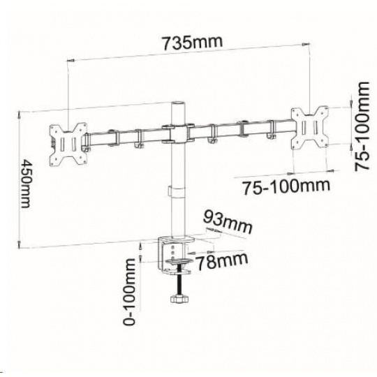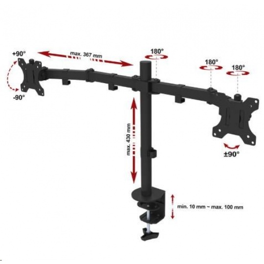 Nejlevnější dvoumonitorový držák ErgoSolid FN40 Levný, přesto vynikající kvality, držák na 2 monitory do kanceláří, školních učeben, firem a podniků - plně nastavitelný, záruka 5 let I vynikající držák může být levný - nabízíme Vám za bezkonkurenční cenu stolní dvoumonitorový držák pro monitory 13-29" s nastavením vdzálenosti, výšky, náklonu, otáčením do stran a funkcí pivot (otočení monitoru na šířku nebo na výšku). Držák má velmi pevnou spolehlivou konstrukci z ocely. Dodáván je v černém provedení a v balení naleznete krom instalačního materiálu i 2 typy úchytů na stolovou desku (na okraj stolu pomocí svěráku a do prostoru stolu pomocí šroubovice - nutné vyvrtání 1 otvoru o průměru 8mm). Na držák poskytujeme záruku 5 let. Ergosolid FN40 - precizní držák na 2 monitory za nejlepší cenu - nastavení 3D, záruka 5 let - držák do kanceláře, do školy, učebny, firmy nebo podniku Za kvalitu držáku plně ručíme, nebudete-li spokojeni, můžete nám zboží vrátit během 30-ti dní od zakoupení. Tato záruka platí i v případě nákupu na IČO. Nejlevnější dvoumonitorový držák - zavěšení 2 monitorů, nastavení 3D, TOP kvalita za bezkonkurenční cenu - držáky Ergosolid FN40 Technické údaje: celková nosnost 20kg maximální hmotnost 1 monitoru 10kg podporuje VESA standardy 75x75 a 100x100 univerzální, vhodný pro zavěšení monitorů s úhlopříčkou 13 až 29 palců nezávislé nastavení každého monitoru otáčení do stran +/- 180° náklon +/- 45° fukce PIVOT - otočení monitoru na šířku nebo na výšku nastavení vzdálenosti monitoru od úchytu délka ramene 367mm 3 klouby pro nastavení pozice na každém rameni nastavitelná výška ramen max. 430mm uchycení na stolové desky o průměru 10mm až 100mm balení obsahuje 2 typy uchycení na stolové desky (svěrák + šroubovice) materiál ocel barevné provedení černé balení obsahuje instalační materiál instalační návod v CZ záruka 5 let Cenově nejvýhodnější dvoumonitorový držák s 3D nastavením polohy monitoru. Bezpečná a spolehlivá konstrukce, 2 typy uchycení na stolové desky o průměru 10-100mm. Držák podporuje VESA standardy pro uchycení monitoru: VESA 75x75 VESA 100x100.
