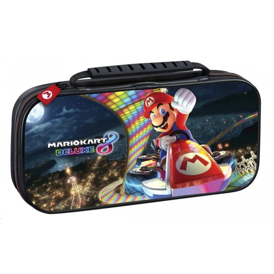 Luxusní cestovní pouzdro NNS50 s motivem Mario Kart 8 Deluxe V tomto luxusním cestovním pouzdru s motivem závodní hry Mario Kart 8 Deluxe můžete bezpečně a bez obav převážet svou oblíbenou herní konzoli Nintendo Switch, Switch Lite nebo Switch – OLED Model. Nedílnou součástí tohoto pouzdra je polohovatelný stojánek, který vám při používání konzole umožňuje upravit pozici obrazovky podle potřeby. Když později uložíte konzoli zpět do pouzdra, ochrání stojánek její obrazovku před poškrábáním. Třešničkou na dortu pak je přívěsek na jezdci zipu s Mariovým logem v podobě písmene „M“. Balení rovněž obsahuje dvě plastová pouzdra na herní karty, z nichž do každého se vejdou čtyři herní karty, a také dvě plastová pouzdra na microSD karty, přičemž do každého z těchto menších pouzder se vejdou dvě microSD karty a každé z těchto pouzder se vejde do libovolné pozice ve větším pouzdru na herní karty. SPECIFIKACE PRODUKTU: Výrobce: R.D.S. Industries Distributor: Bigben Interactive Distributor v ČR: HYPE Kategorie: herní příslušenství Platforma: Switch, Switch Lite & Switch – OLED Model.