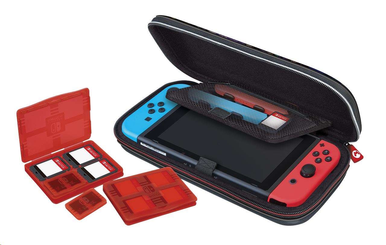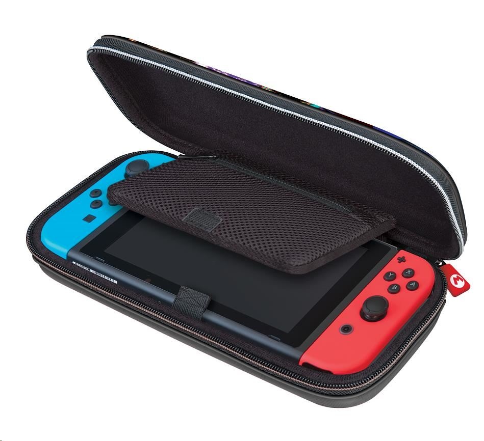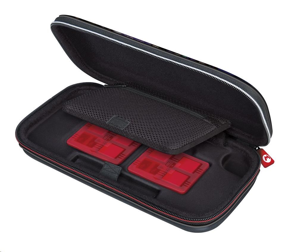 Luxusní cestovní pouzdro NNS50 s motivem Mario Kart 8 Deluxe V tomto luxusním cestovním pouzdru s motivem závodní hry Mario Kart 8 Deluxe můžete bezpečně a bez obav převážet svou oblíbenou herní konzoli Nintendo Switch, Switch Lite nebo Switch – OLED Model. Nedílnou součástí tohoto pouzdra je polohovatelný stojánek, který vám při používání konzole umožňuje upravit pozici obrazovky podle potřeby. Když později uložíte konzoli zpět do pouzdra, ochrání stojánek její obrazovku před poškrábáním. Třešničkou na dortu pak je přívěsek na jezdci zipu s Mariovým logem v podobě písmene „M“. Balení rovněž obsahuje dvě plastová pouzdra na herní karty, z nichž do každého se vejdou čtyři herní karty, a také dvě plastová pouzdra na microSD karty, přičemž do každého z těchto menších pouzder se vejdou dvě microSD karty a každé z těchto pouzder se vejde do libovolné pozice ve větším pouzdru na herní karty. SPECIFIKACE PRODUKTU: Výrobce: R.D.S. Industries Distributor: Bigben Interactive Distributor v ČR: HYPE Kategorie: herní příslušenství Platforma: Switch, Switch Lite & Switch – OLED Model.