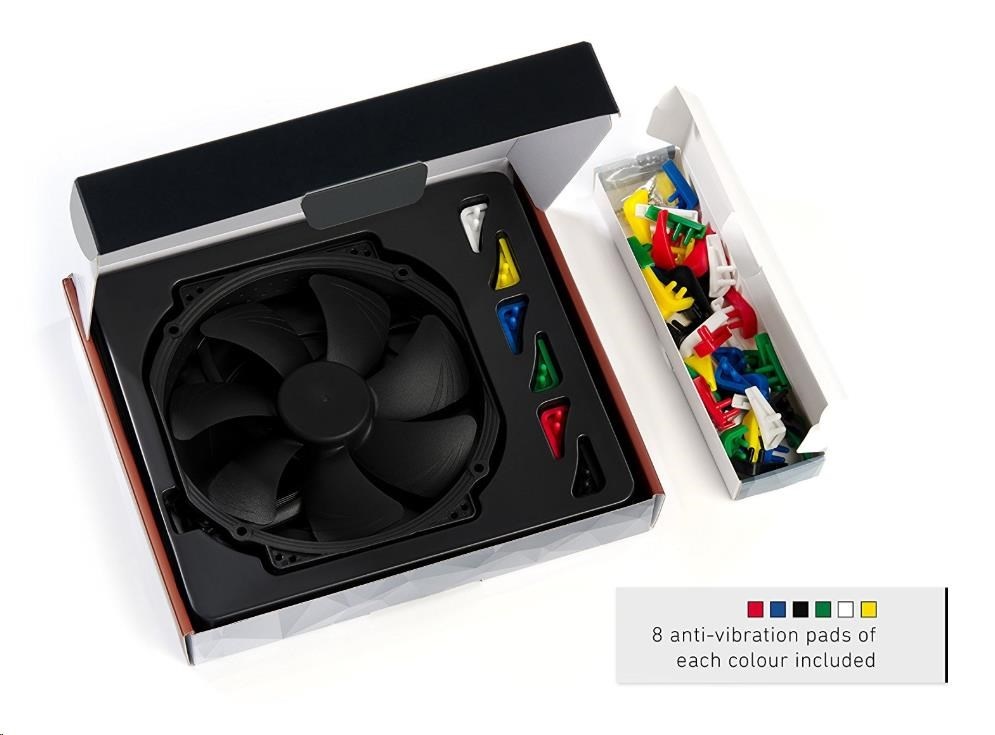 ventilátor, tichý, rozměry 140x150x25mm, průtok 140.2 m3/h, 300 až 1500 otáček, SSO2, 4pin PWM, s vyměnitelnými barevnými antivibračními podložkami