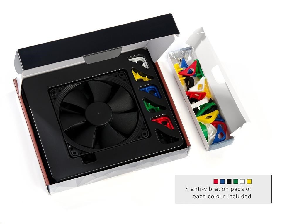 ventilátor, tichý, rozměry 120x120x25mm, hlučnost 18.6 až 22.4dB, průtok 74.3 až 93.4 m3/h, 300 až 1500 otáček, optimalizovaná geometrie a povrch 7 lopatek, SSO2, edice Chromax - vyměnitelné barevné antivibrační podložky